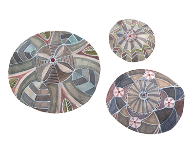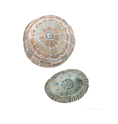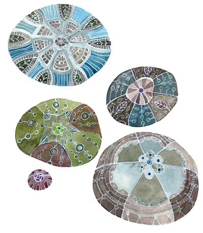 This series is inspired by the intricate, lacy work of crocheted threads and the mesmerizing shape of a smooth river rock. Each one is a universe all on it's own.